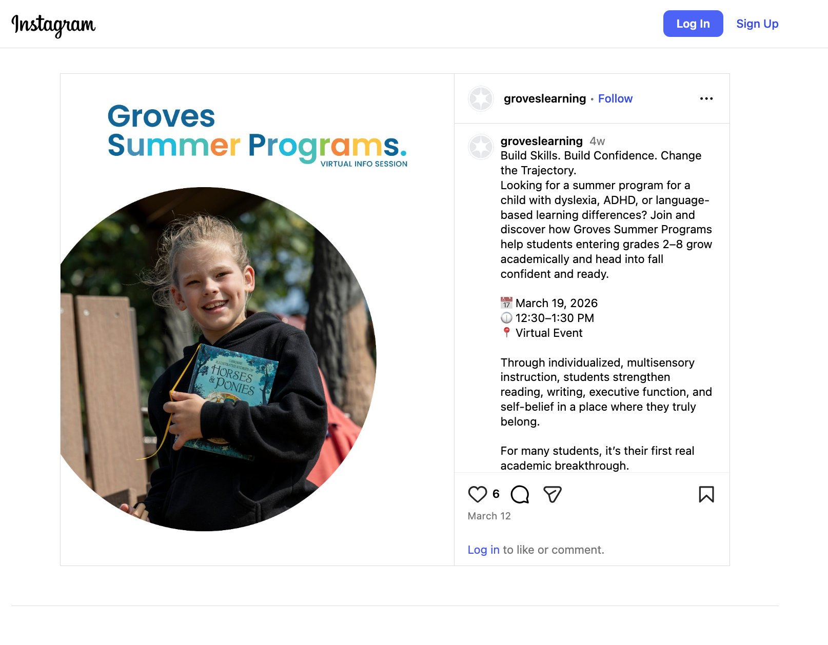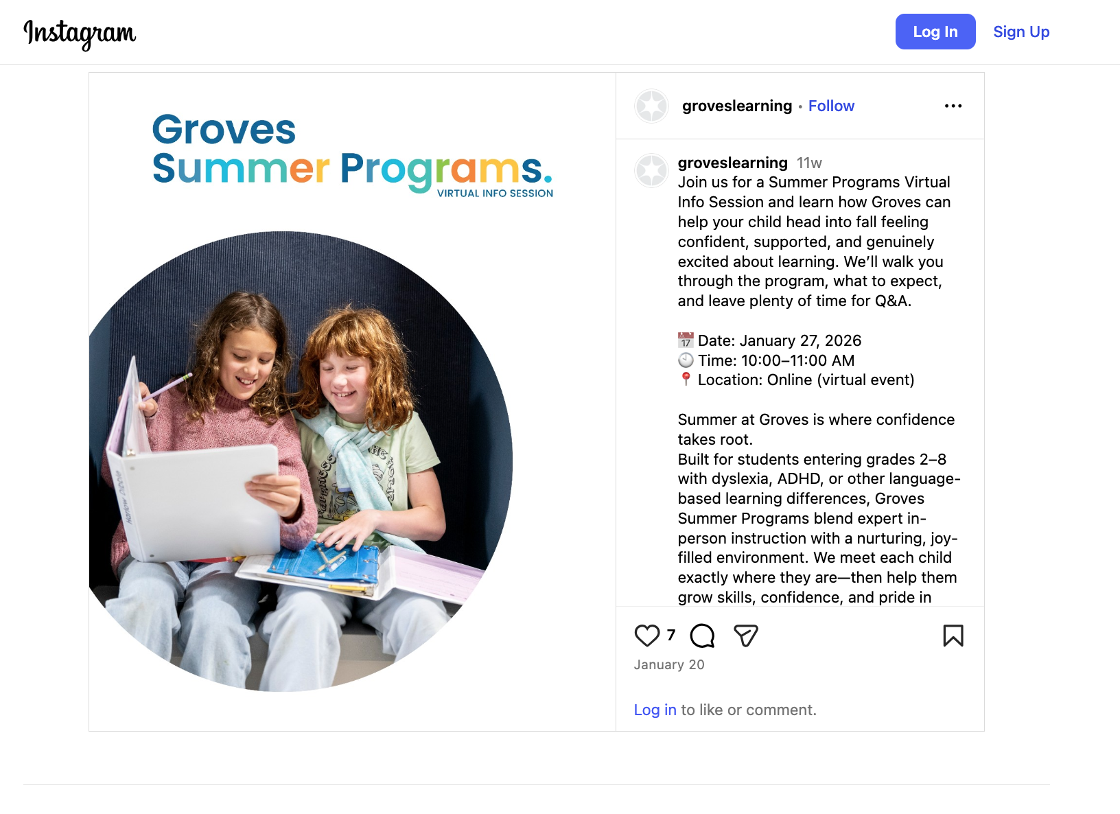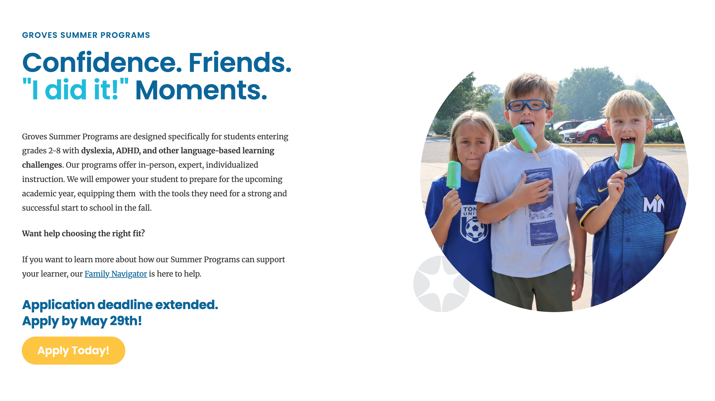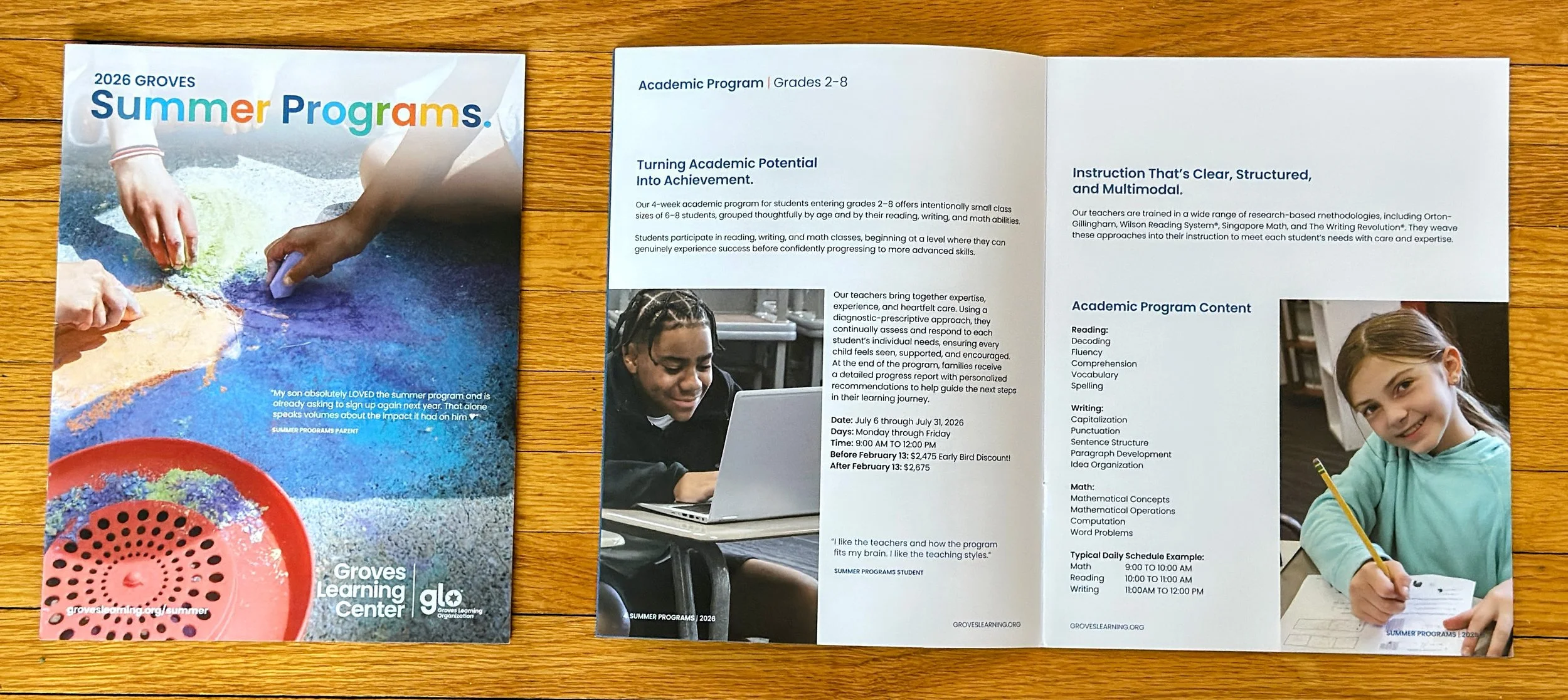 Groves Summer Programs serves students in grades 2–8 with dyslexia, ADHD, and language-based learning differences. The campaign needed to feel warm, joyful, and confident — not clinical. Not remedial. A summer kids actually want to go to.